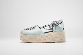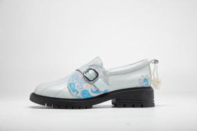 蓝夹缬主题系列鞋款的设计灵感来源于(温州)蓝夹缬,“种蓝得靛,衣被乃染;雕花夹布浸,蓝白相与间”。蓝夹缬印染技艺是国家级非物质文化遗产,承载着吉祥、幸福的美好寓意。据史料记载,蓝夹缬图案多以昆剧、乱弹、京剧等戏文情节为纹样,辅以花鸟虫兽等吉祥纹样。选用柔软的生态羊皮提升了穿用的舒适度,在传承国家级非物质文化遗产的同时,也宣扬绿色环保的理念。