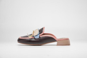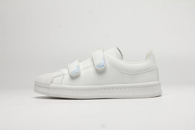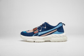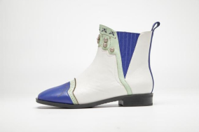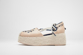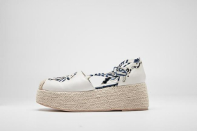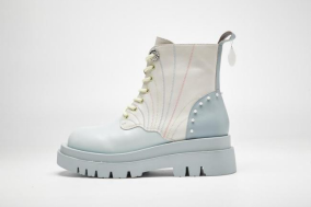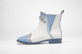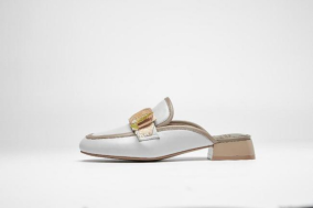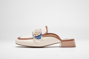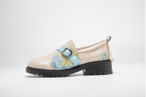 鞋面采用生态羊皮,配色选用白色、棕色及高饱和度的克莱因蓝,与贝雕主题交相映衬,整体造型精美,不失现代感。