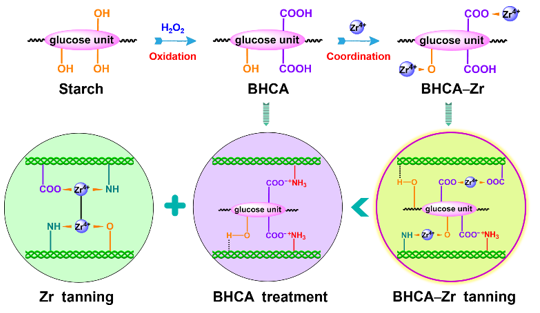 四川大学石碧院士团队余跃博士、王亚楠教授等提出利用可再生生物质——淀粉为主要原料,通过对淀粉进行可控的氧化降解,制备了一种宽分布的多官能团羟基羧酸配体,并构建了羟基羧酸–锆配合物(BHCA–Zr)的无铬协同鞣制体系,解决了传统锆鞣剂稳定性和鞣制效果不佳的问题,为皮革工业的绿色可持续发展提供了强力支撑。