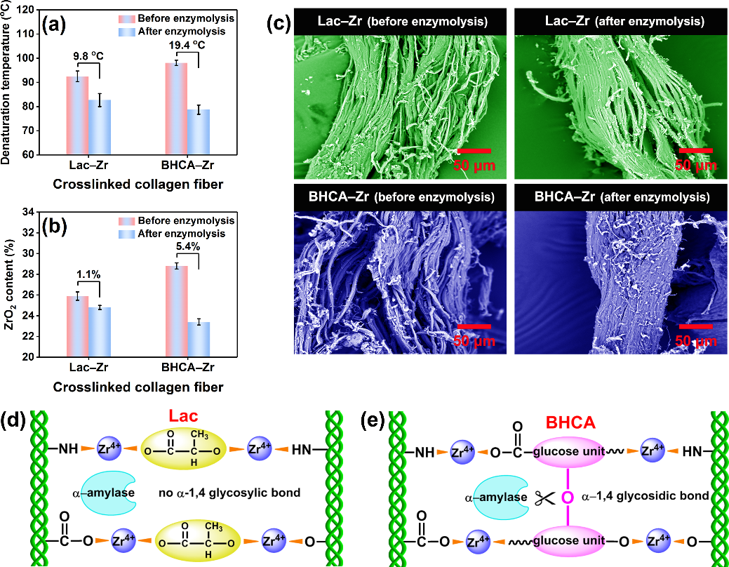 图4. Lac–Zr和BHCA–Zr交联胶原纤维酶解前后的变性温度(a)、ZrO2含量(b)和SEM照片(c);Lac–Zr (d) 和 BHCA–Zr (e) 交联结构示意。