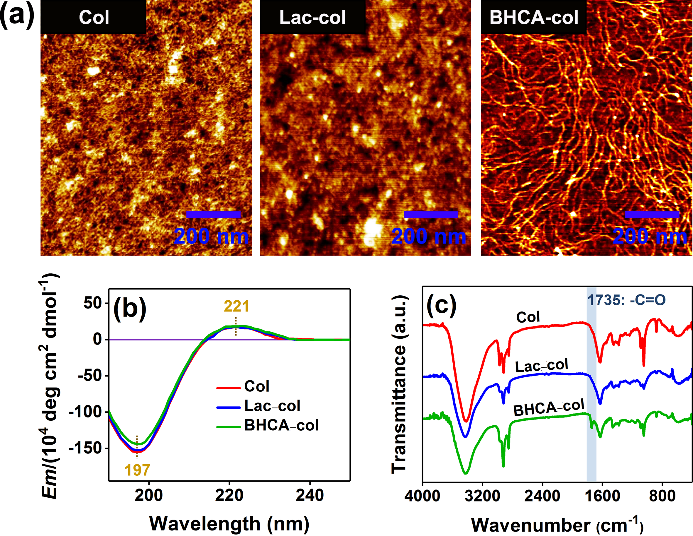 图3. Col、Lac–col 和 BHCA–col 的 AFM 图像 (a)、CD 光谱 (b) 和 FT-IR 光谱 (c)