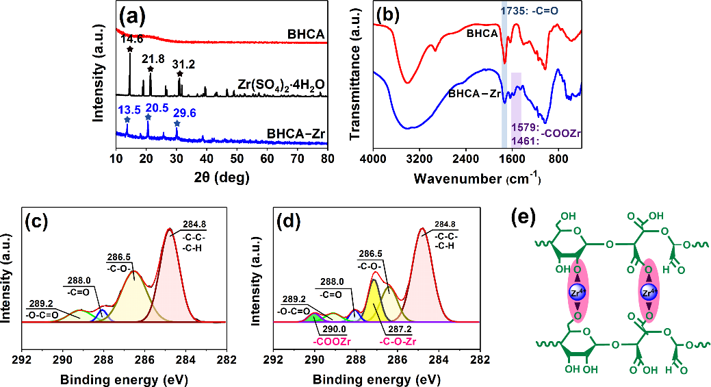 图2. BHCA和BHCA–Zr的XRD图谱(a)和FT-IR光谱(b);BHCA(c)和BHCA–Zr(d)的高分辨率C 1s XPS光谱,以及BHCA–Zr配位机理示意(e)。