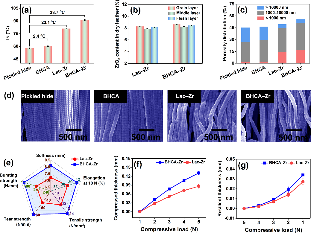 图1. 浸酸牛皮/鞣革的收缩温度(a)、锆分布(b)、孔隙率分布(c)和扫描电镜图像 (d);坯革的物理性质(e),压缩性能(f)和回弹性能(g)。